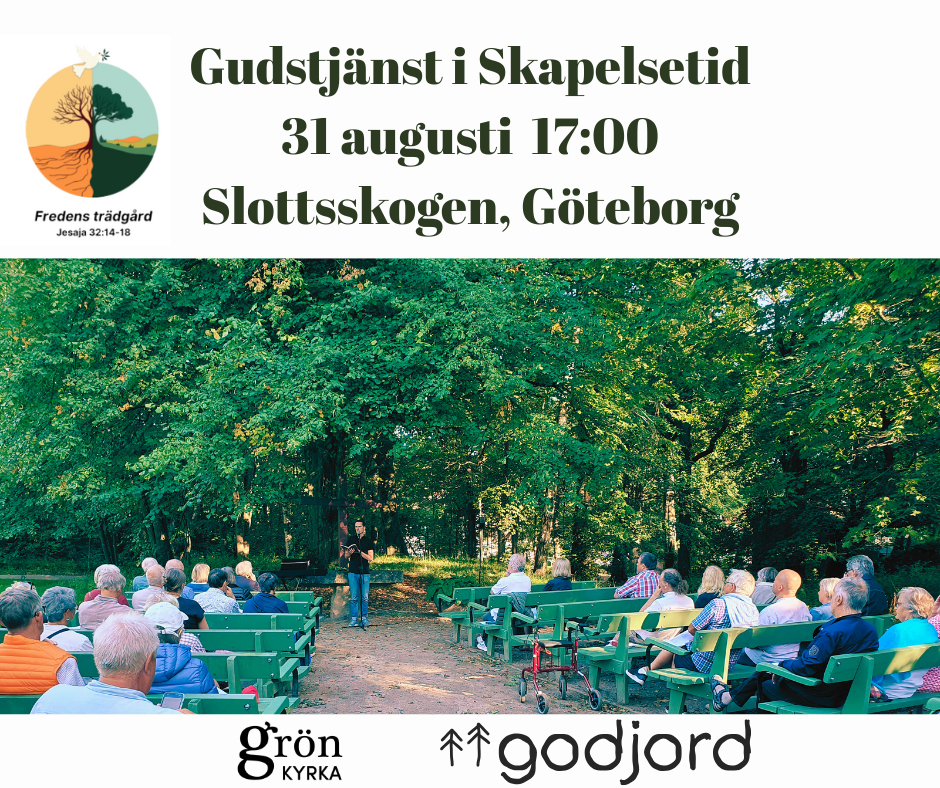 God Jord och Grön Kyrka i Göteborgsregionen arrangerar tillsammans gudstjänst i friluftskyrkan i Slottsskogen Göteborg som start på årets Skapelsetid!